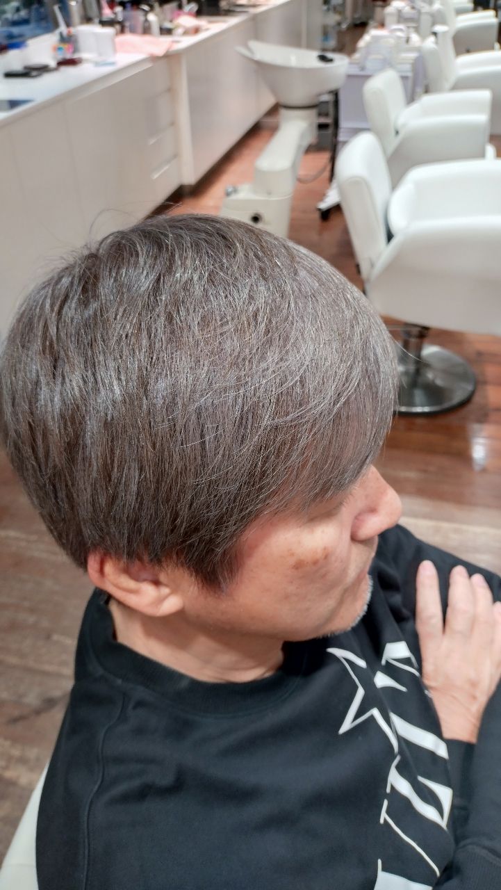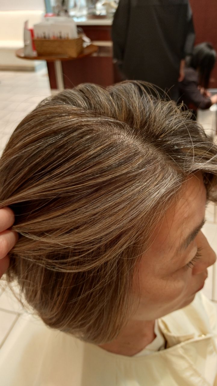 黒髪と白髪の中間くらいの明るめブラウンで馴染ませていきます。ブリーチ無しのカラーリングなので、地毛を活かした仕上がりになります。