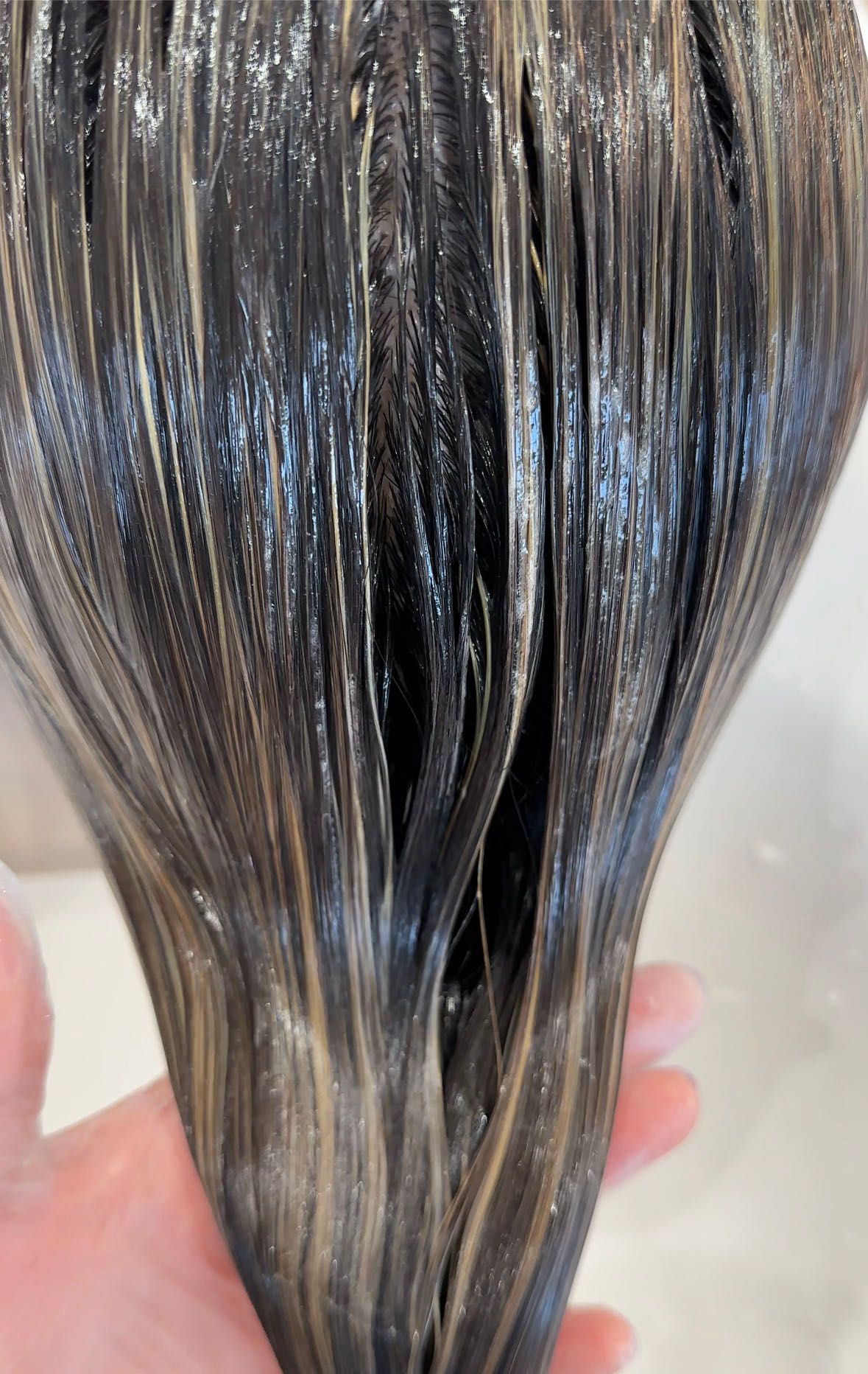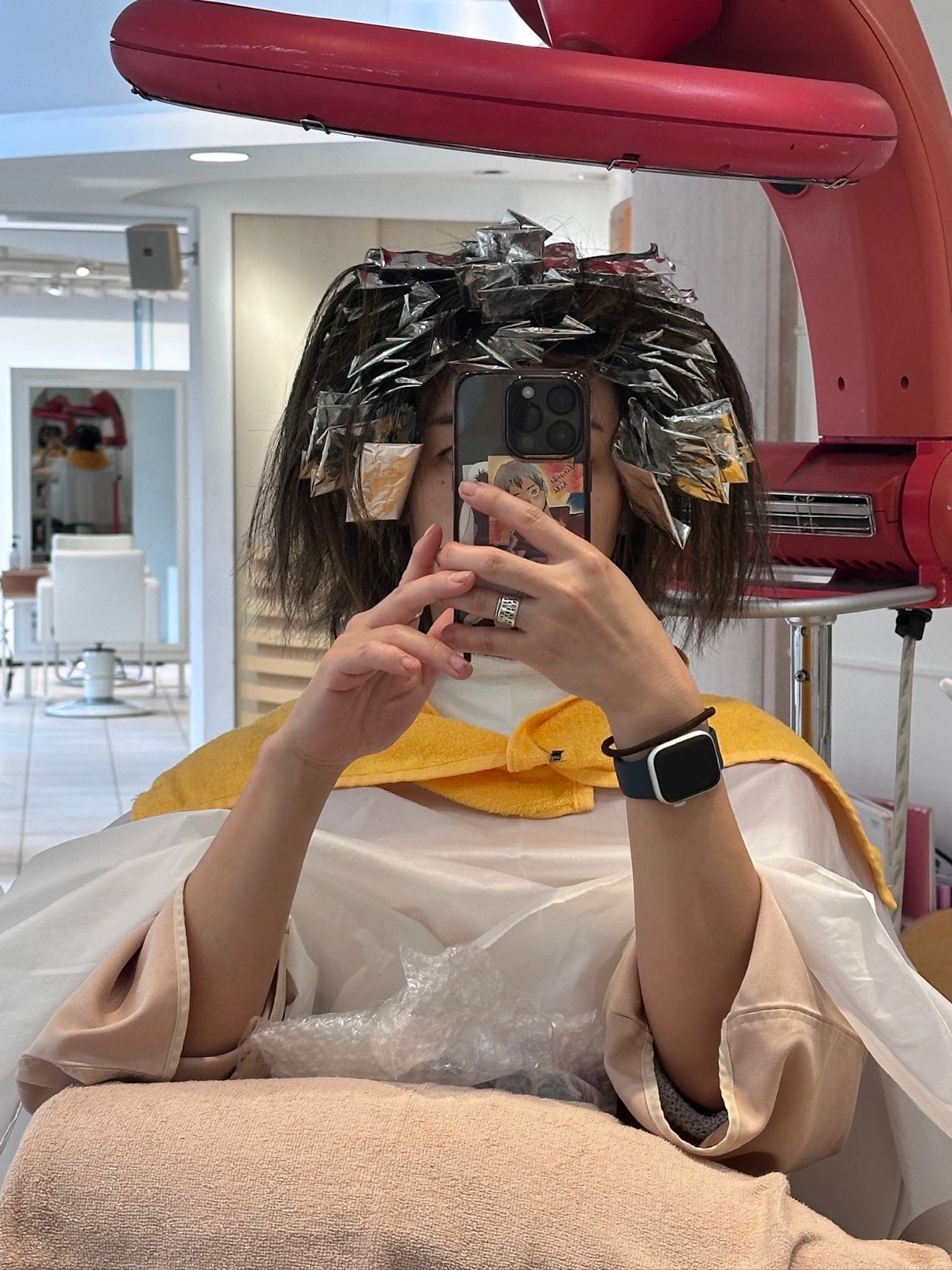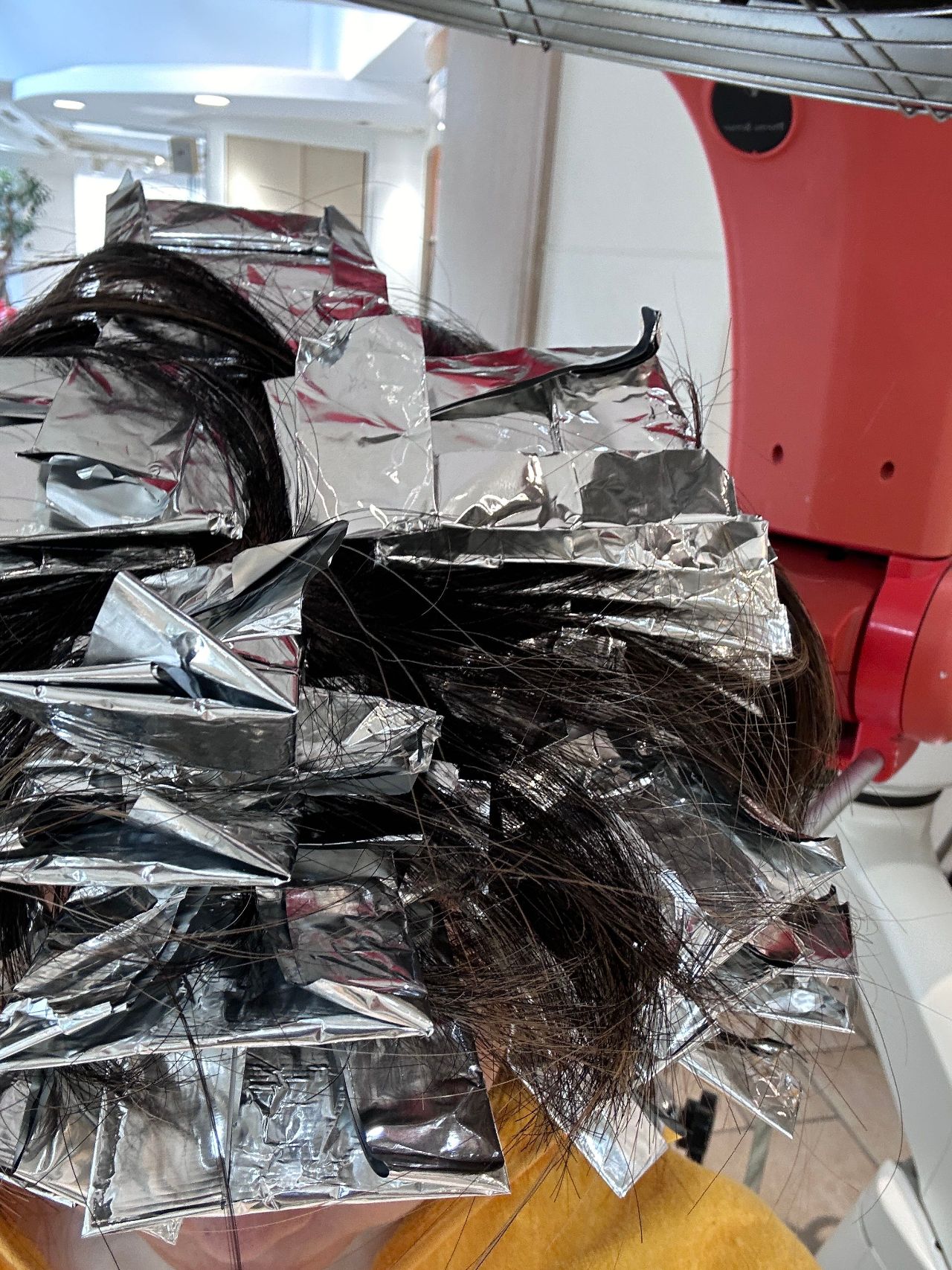 わたしはホイルをいっぱい入れてもらって明るさが出たらシャンプーして次の工程なのですが、前回のカラーが全体染め(明るさによって変わってきます)の場合、このホイルの外にある髪の毛たちをトーンダウンする必要があります。