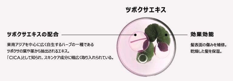 *1:ツボクサエキス(コンディショニング成分)+ジメチコノール(コンディショニング成分)+アモジメチコン(毛髪補修成分)