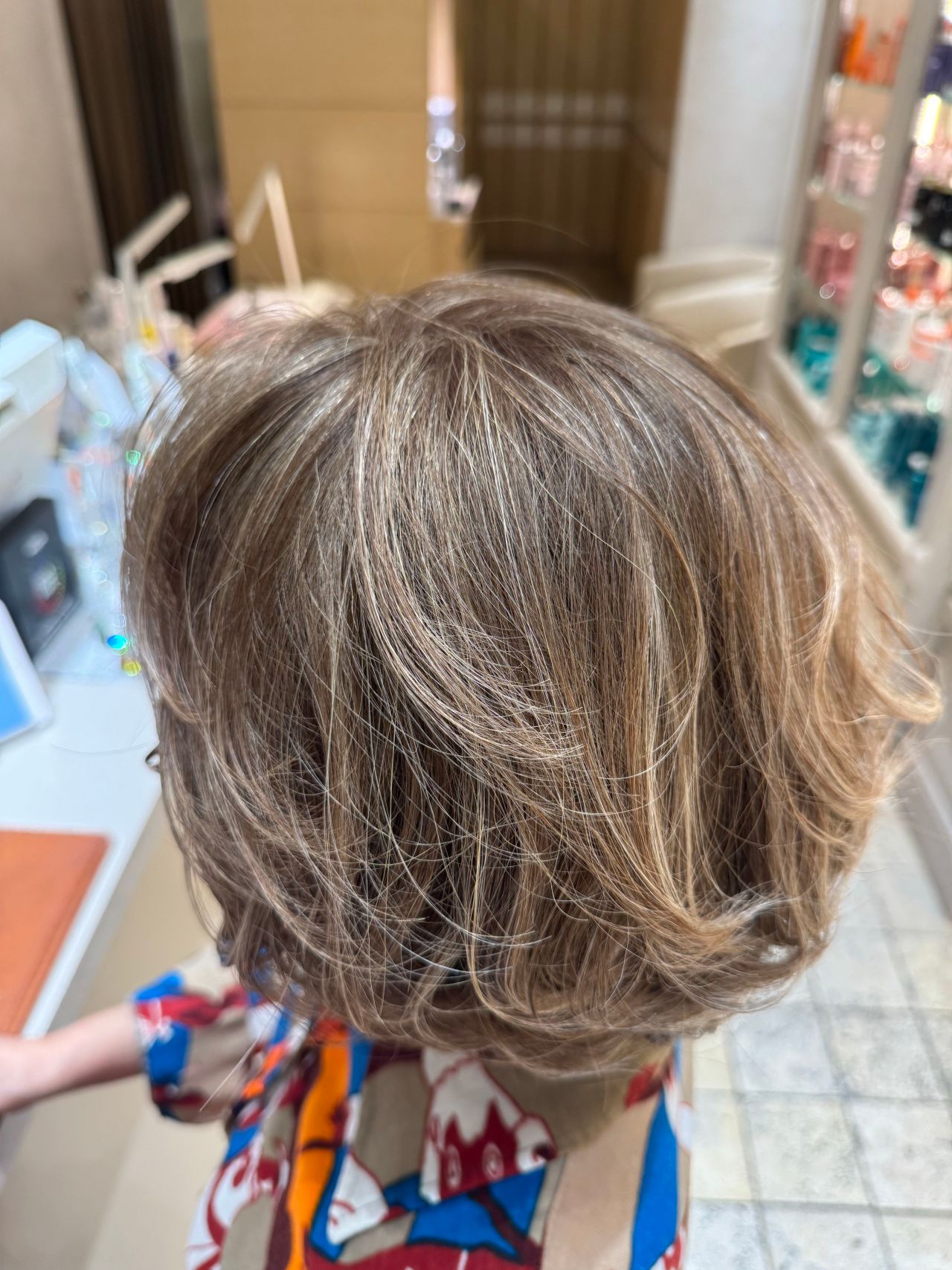 白髪をぼかすデザインなどとは異なり、ファッションカラーで白髪を甘く染めつつハイライトを施しています。