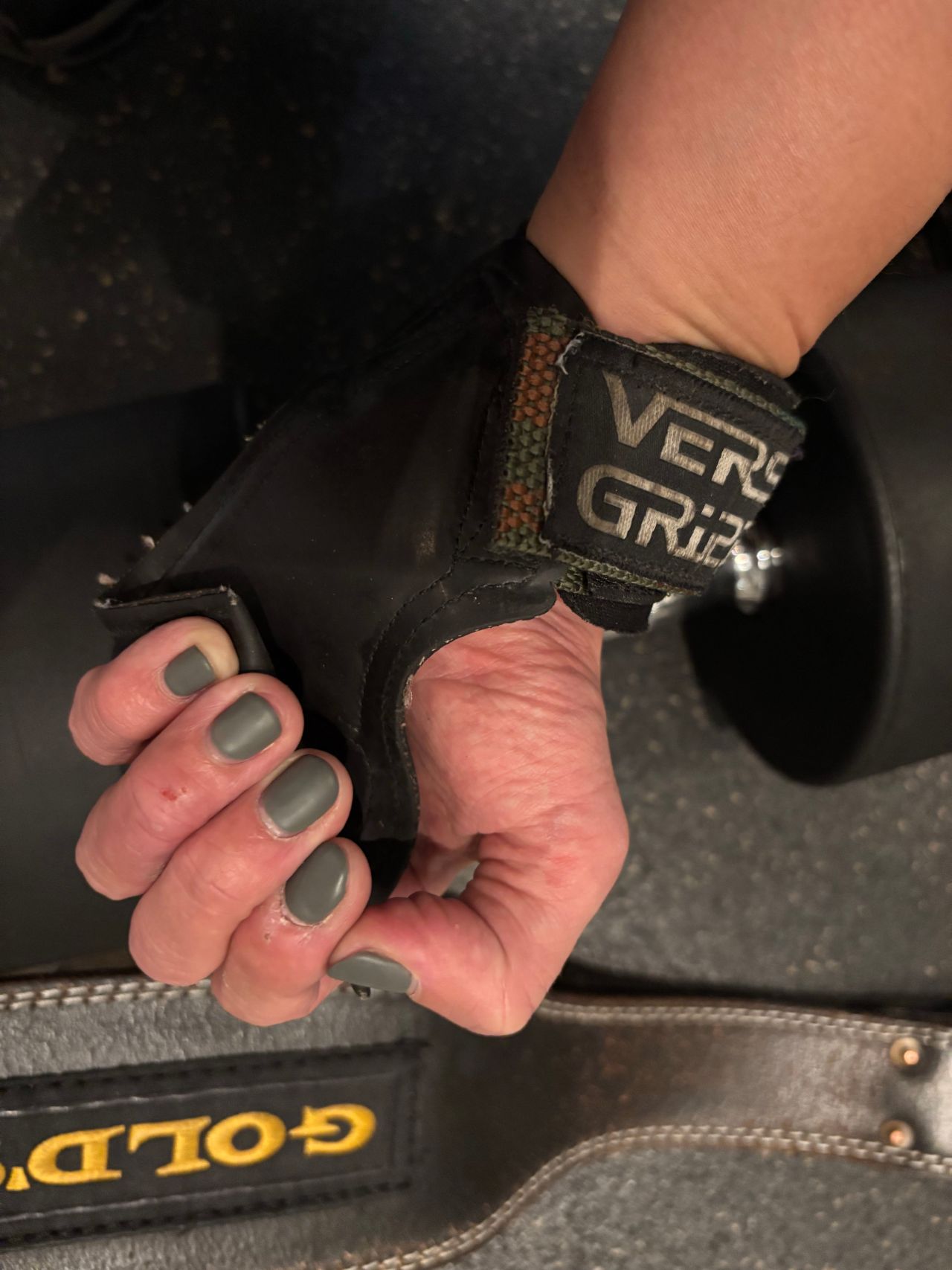 手首につけてますがベロがついていてダンベルやバーベル、マシンの持ち手を持つときにグリップをホールドするものです。