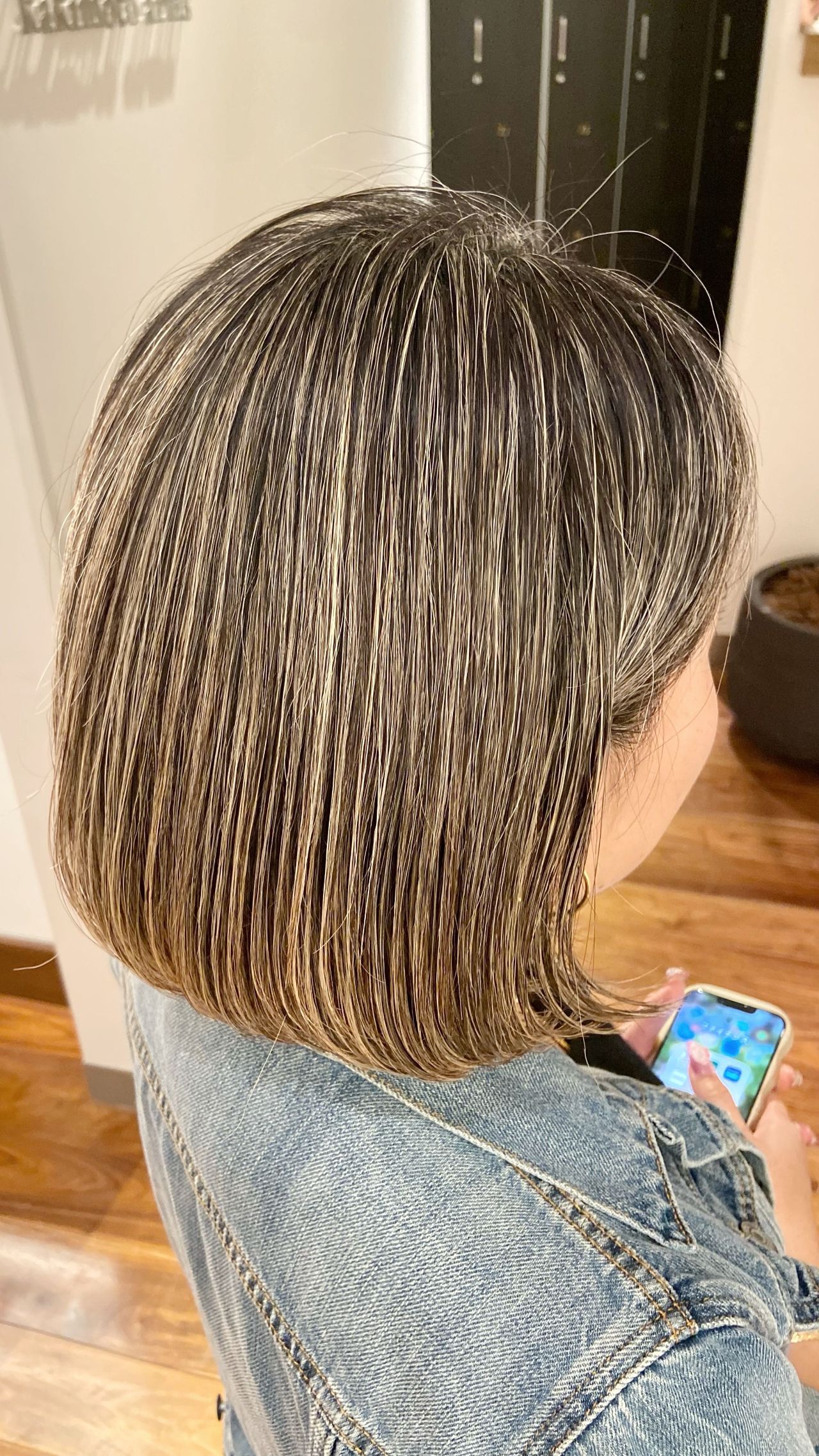 ブリーチハイライトを細かくブレンドして色味も少しグレーに寄せて白髪とハイライトをブレンドしてカラーしております♡