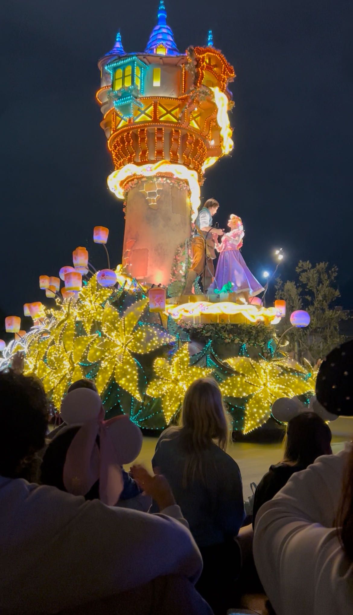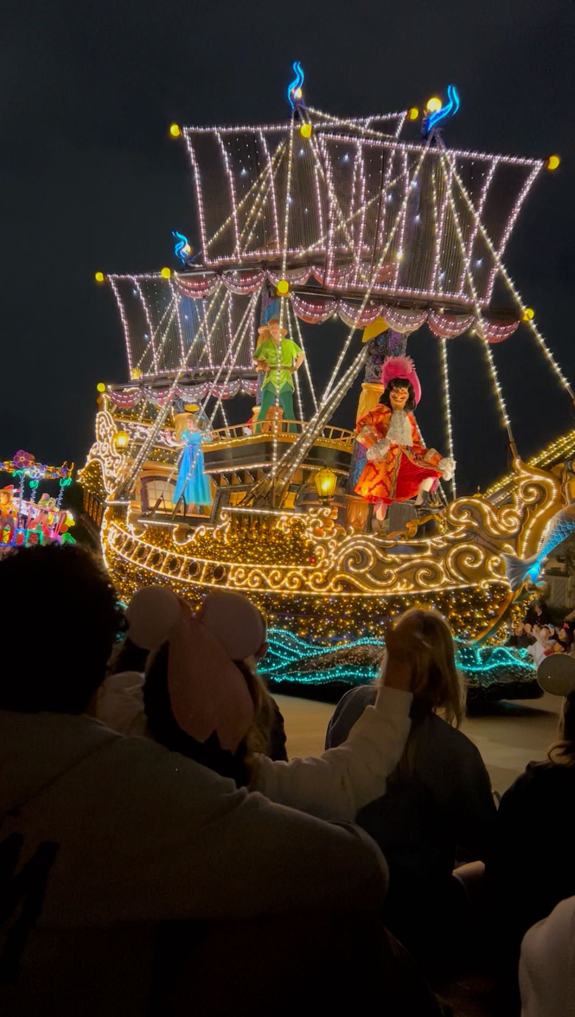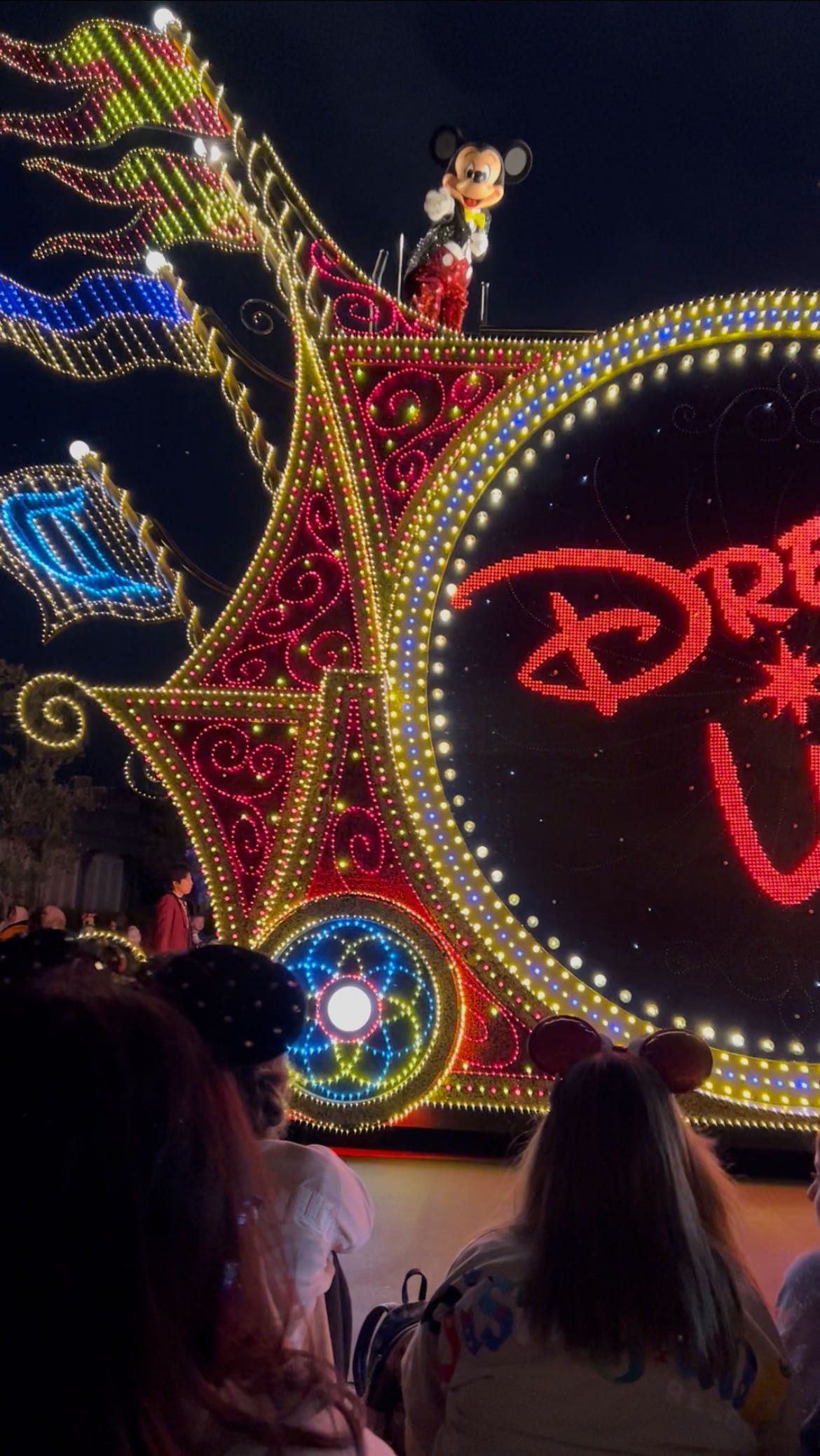 昼とはうってかわって夜はイルミネーションをふんだんに使用した足場と共に向かってきてくれます!1枚目のミッキーはこっちに向かって手を振ってくれました!笑