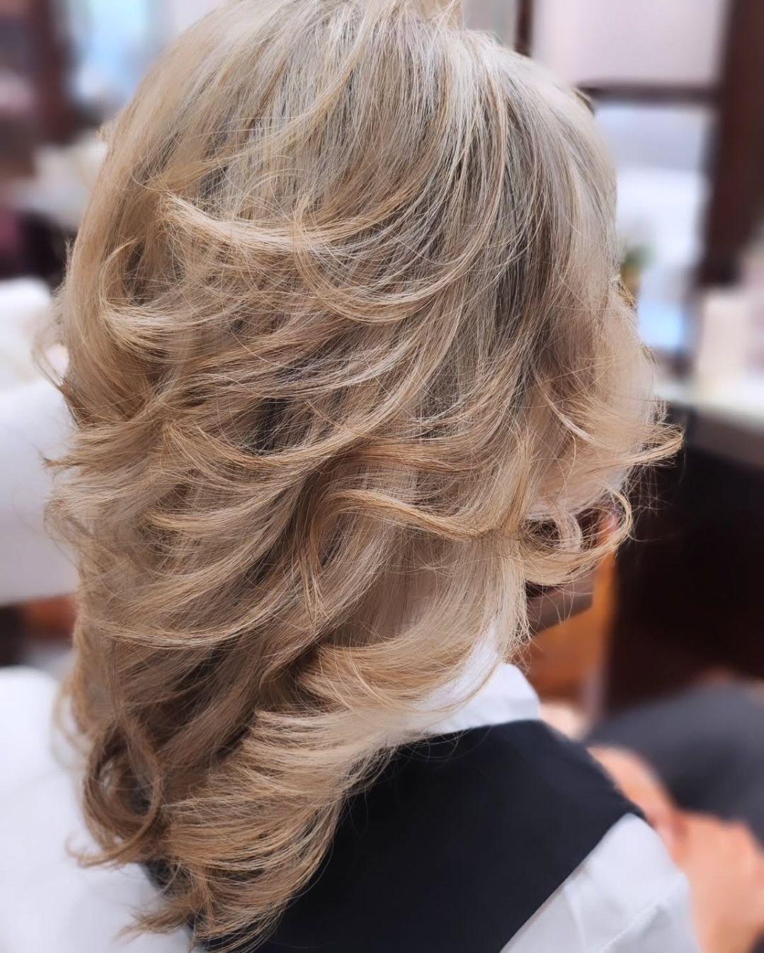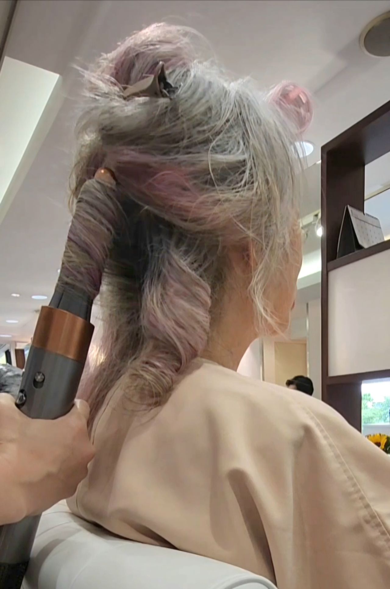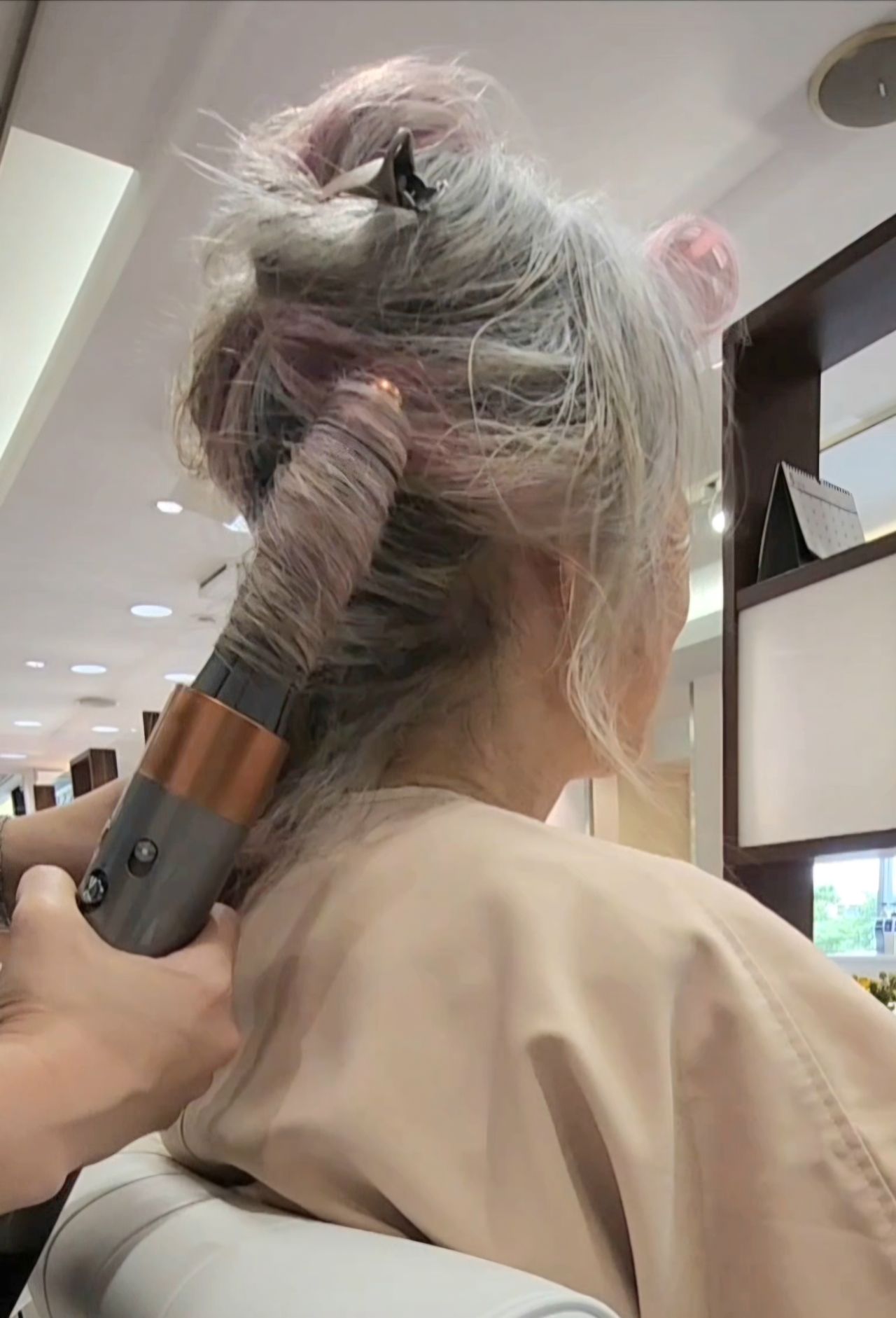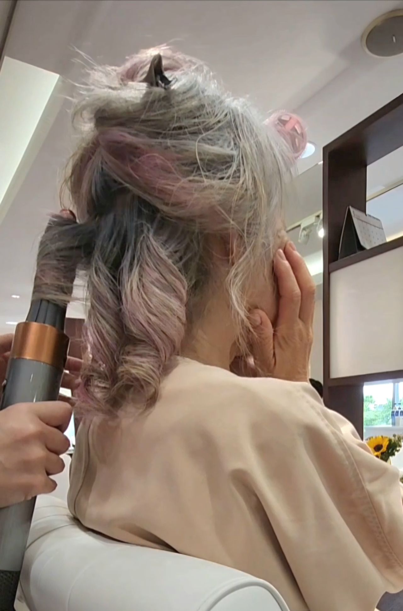 Afterでは毛先を5~6cmカットして厚みを出し、Dysonエアラップでふわっと仕上げ。