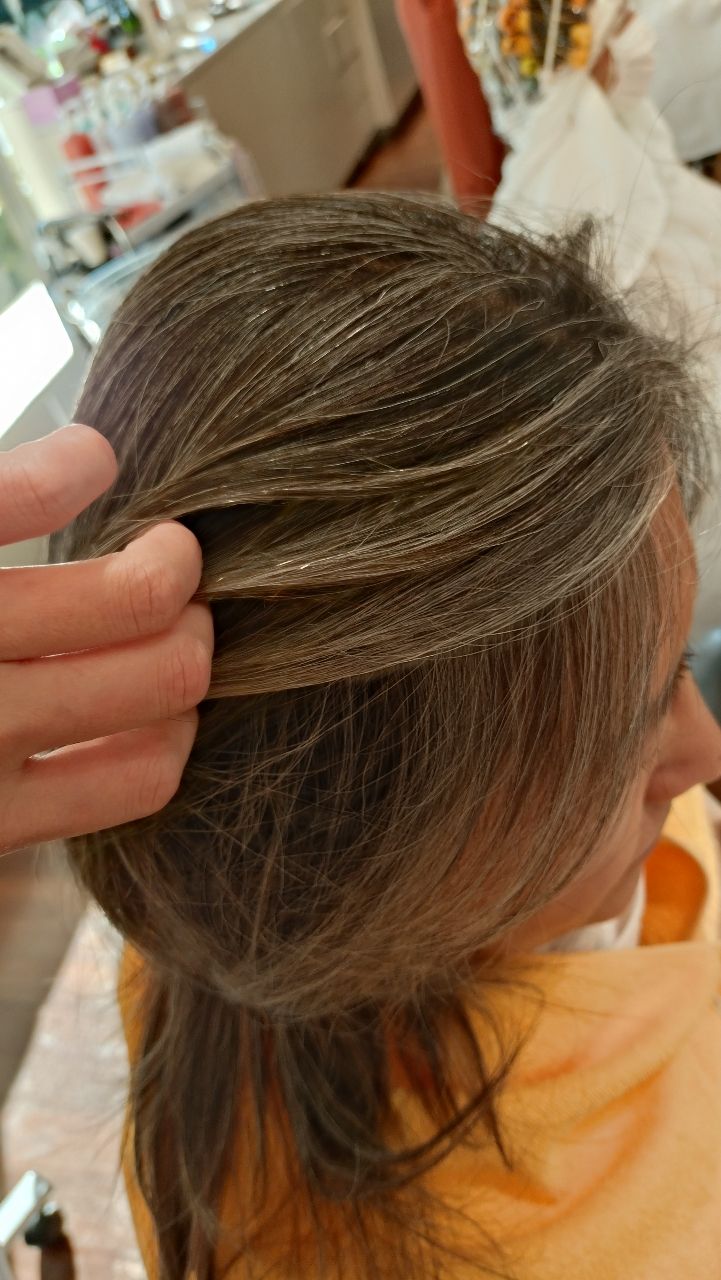 こちらのお客様は、全体的にバランス良くちらほらグレイヘアがあるのですが、特に顔周りに白髪がかたまって生えている状態です。