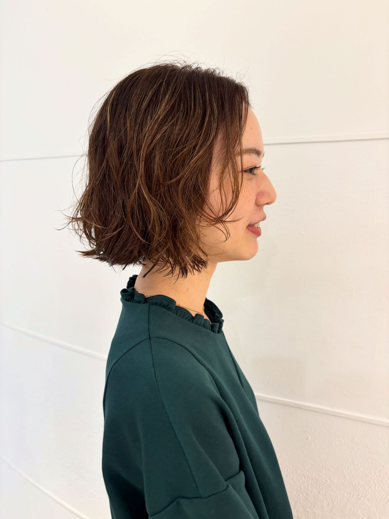 このようなニュアンスパーマなボブも首元をチラッと見せる事でモコモコのニットと合わせても可愛いくなります♡